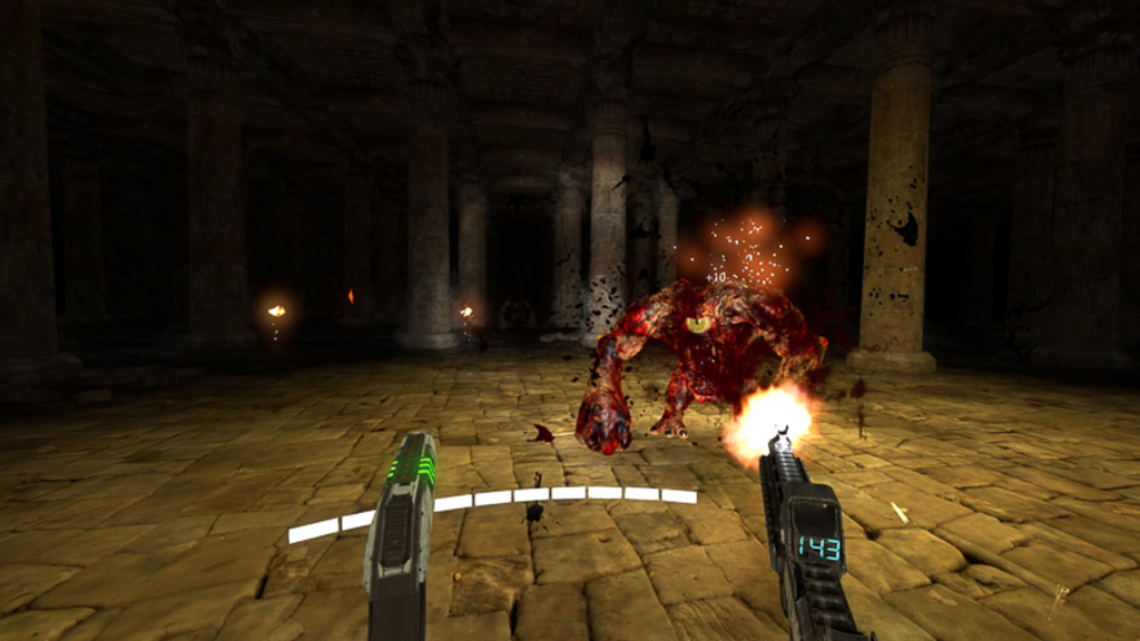 VRなので360℃見渡せるのですが、後ろ側からは敵が来ない親切設計,,,かと思いきや遠距離攻撃してくる敵や、足の早い敵、そして圧倒的な数の暴力により休む暇はありません。