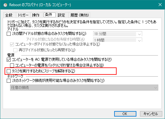 >「タスクを実行するためにスリープを解除する」のチェックを外す