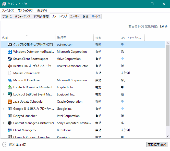 追加済みアプリケーションの有効/無効切り替えだけであれば、タスクマネージャーからでも設定できる。